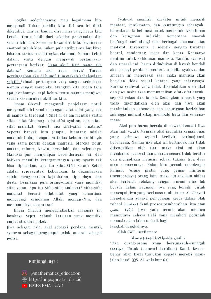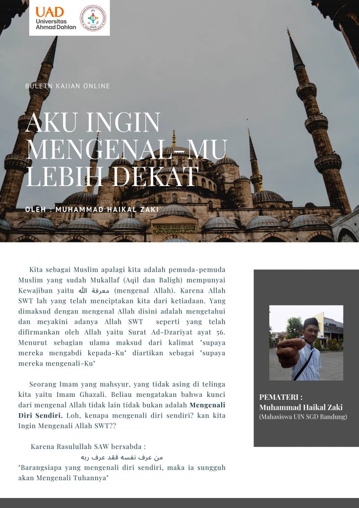 Seorang Imam yang mahsyur, yang tidak asing di telinga kita yaitu Imam Ghazali. Beliau mengatakan bahwa kunci dari mengenal Allah tidak lain tidak bukan adalah Mengenali Diri Sendiri. Loh, kenapa mengenali diri sendiri? kan kita Ingin mengenali Allah SWT??