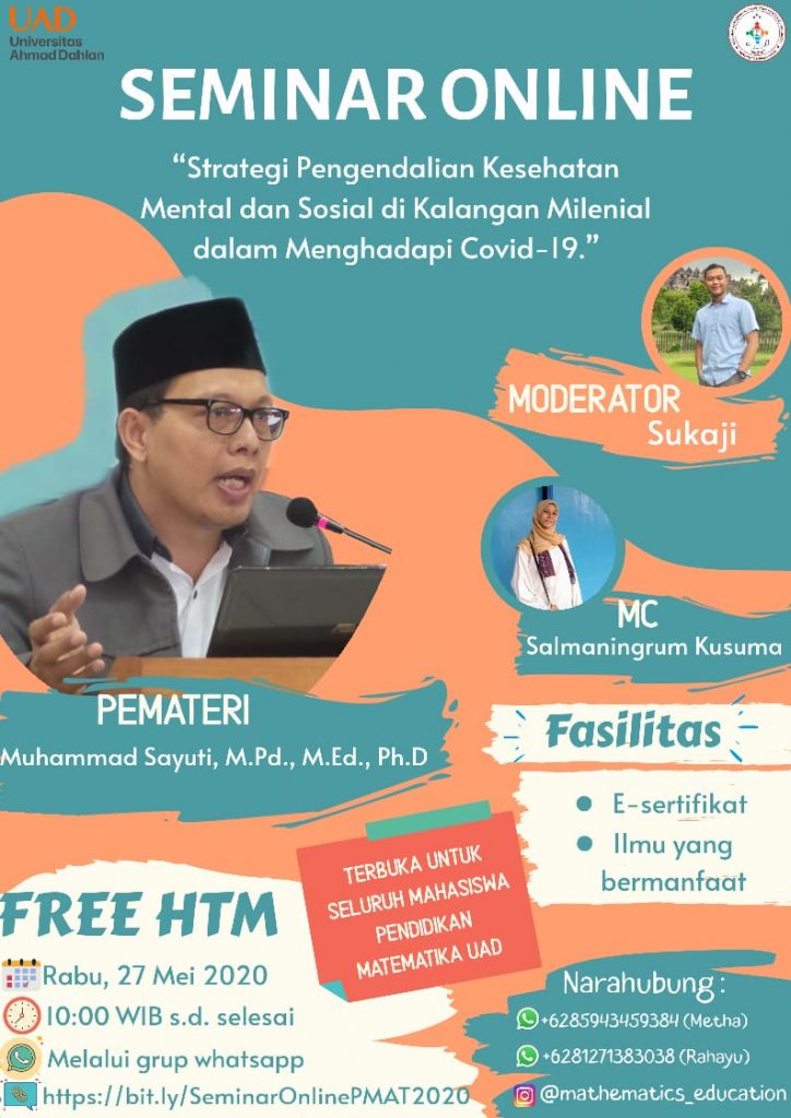 Seminar Topik Online PMAT UAD adalah strategi pengendalian kesehatan mental dan sosial di kalangan milenial dalam menghadapi virus corona. Ada beberaa topik yang dibahas yaitu